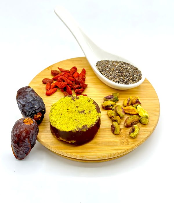 Power up with the wholesome goodness of pistachios, which provide protein, healthy fats, and antioxidants, while dates offer natural sweetness along with fiber and essential minerals. Chia seeds contribute omega-3 fatty acids and fiber, and goji berries provide vitamins, antioxidants, and potential immune-boosting properties. *VEGAN AND GLUTEN FREE*